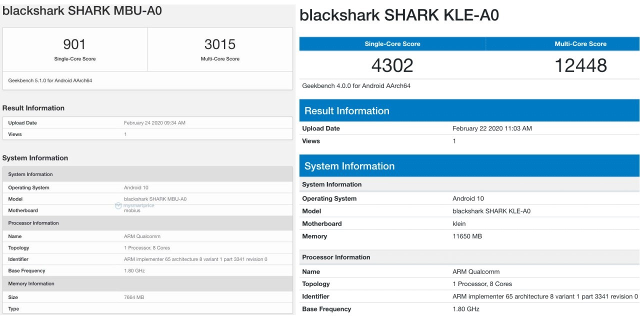 Yang pertama muncul lebih baru pada tanggal 24 Februari 2020 dengan nama model SHARK MBU-A0 pada Geekbench versi 5.0.1. Sementara model kedua membawa nama SHARK KLE-A0 dan muncul di Geekbench 4.0.0 pada tanggal 22 Februari 2020.