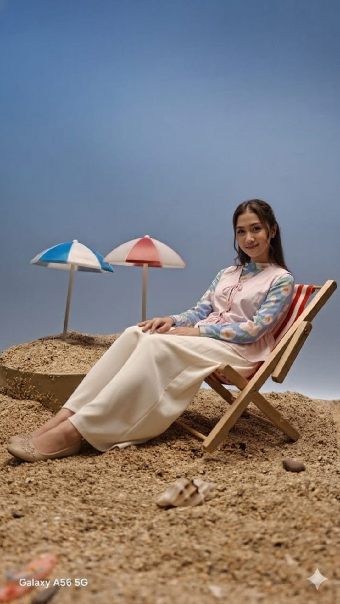 Selanjutnya, saya menambahkan prompt agar hasil fotonya menjadi menariknya. Misalnya memberikan instruksi gabungkan foto ini dengan orang yang duduk di atas kursi pantai dengan riang gembira. Hasilnya AI pada Nano Banana mampu membuat sebuah foto dengan menarik hanya dalam hitungan detik.